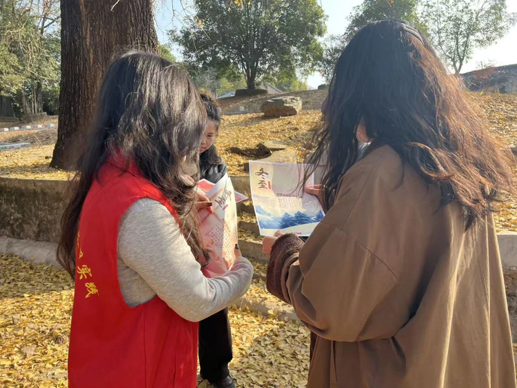 活动中,志愿者身着红马甲,深入村头巷尾、G351国道沿线及陶大对面人流密集的广场,发放通俗易懂的图文漫画宣传单,并面向不同群体开展针对性的讲解介绍,普及文明祭扫知识。面向年轻大学生,志愿者重点传递绿色环保理念,分享鲜花祭祀、植树祭祀、网络追思等缅怀新方式;面向中老年村民,则结合近期火灾案例和消防安全要点,从安全防范与家风传承的双重角度,详细讲解焚香烧纸、抛撒冥币、燃放鞭炮等传统祭祀方式可能带来的火灾隐患和环境问题,解释文明祭祀的相关规定和实际益处,引导大家在表达哀思时注重防火安全,以简约庄重的方式传达深切思念。同时,志愿者还向周边居民讲解殡葬改革最新政策,倡导“厚养薄葬、丧事简办、文明祭祀”的丧葬新风尚,共同维护文明、安全、有序的祭扫环境。